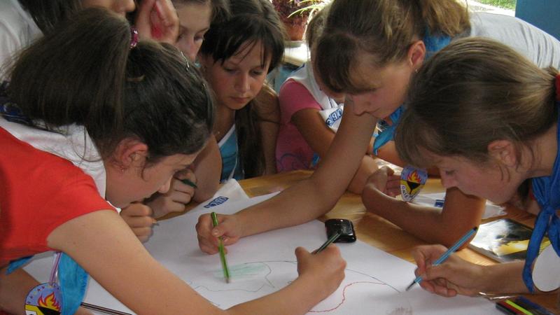 Children drawing their impressions of the Easter Island story, which serves as an example and warning of the over-exploitation of natural resources, 28 June 2012.