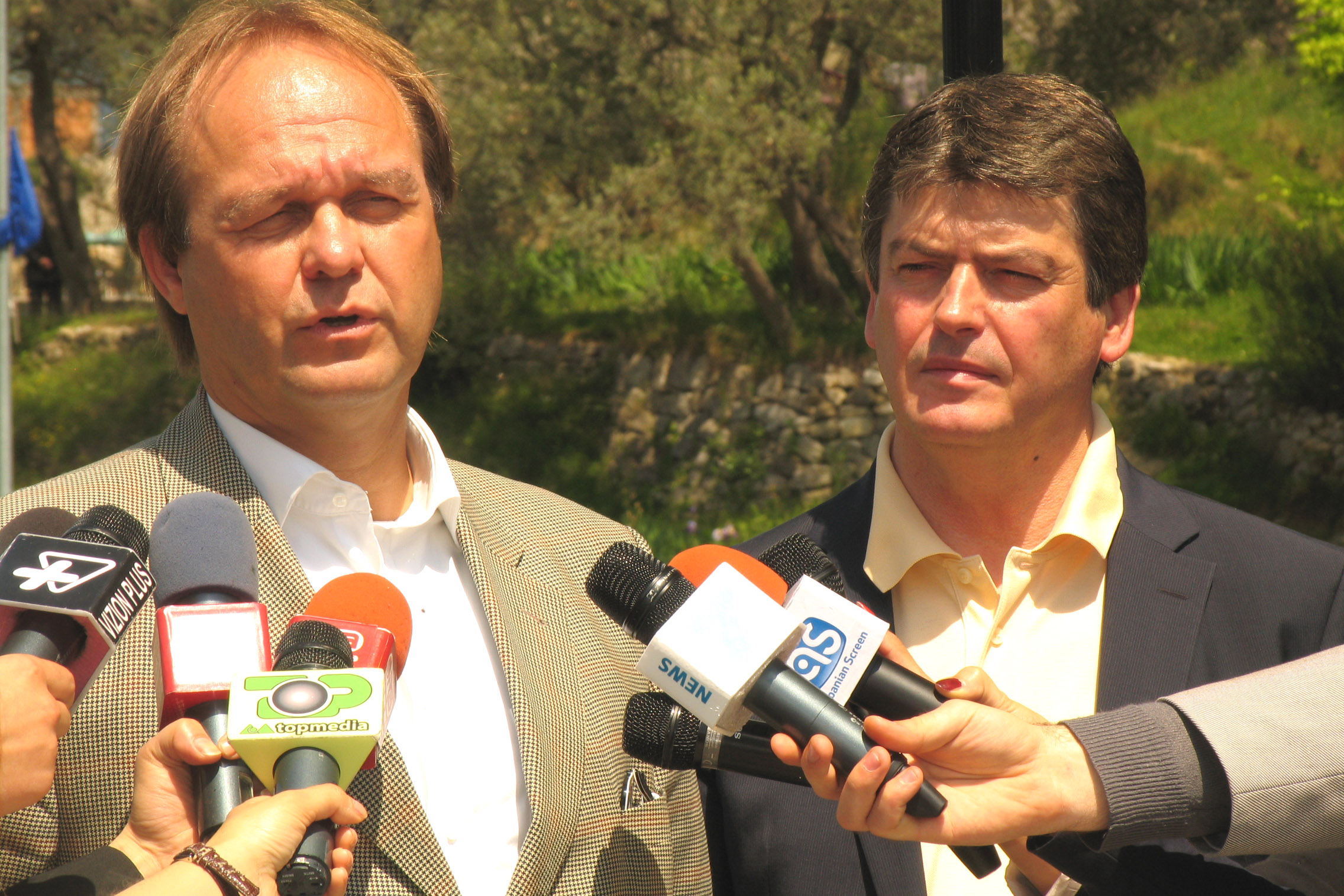 Head of the OSCE Presence in Albania Ambassador Eugen Wollfarth (left) and Albania's President Bamir Topi talk to the media during a visit to Petrela commune in the outskirts of Tirana, on local government election day on 8 May 2011.