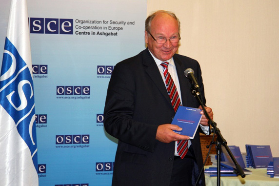 Ambassador Markku Reimaa with a Turkmen language version of his book "Helsinki Catch" at a presentation of the work organized by the OSCE Centre in Ashgabat, 28 September 2010.