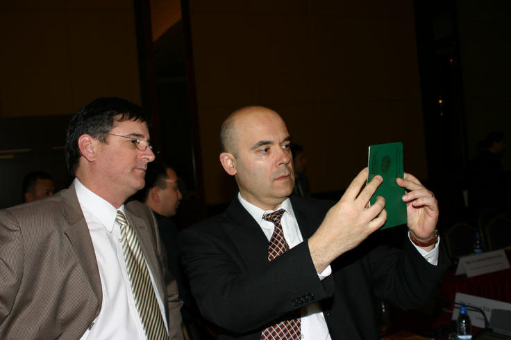 Experts from the OSCE and Germany examine an Uzbek passport, during a workshop on travel documents security, in Tashkent, 1 March 2007.