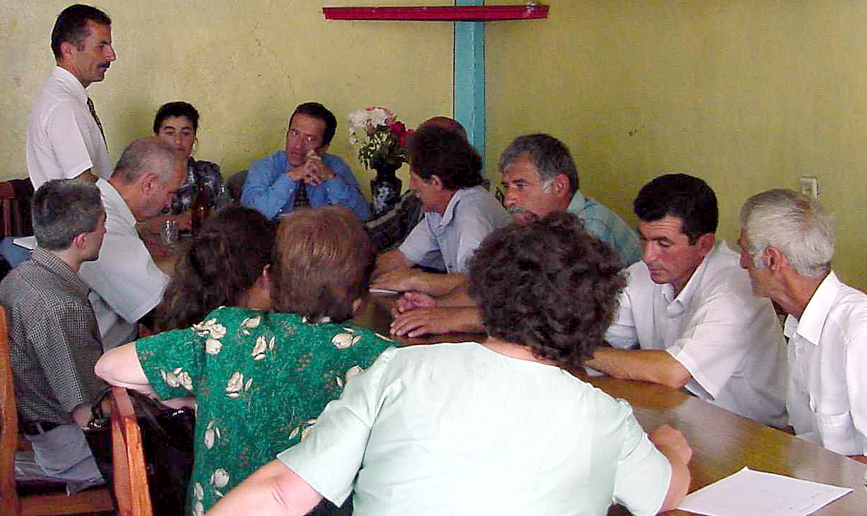 Head of the OSCE Office in Baku, Ambassador Peter Burkhard (centre, with blue shirt), at a discussion in 2002 with NGO representatives in Gusar, northern Azerbaijan.