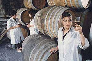 Professional cognac tasters enjoying their first probes from this year's production in the Goychay region, central Azerbaijan, November 2003.