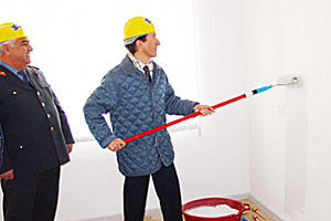 Peter Burkhard, Head of the OSCE Office in Baku symbolically completes the renovation work in the Baku Police Training School by painting the wall of one of the classes, 28 January 2004.