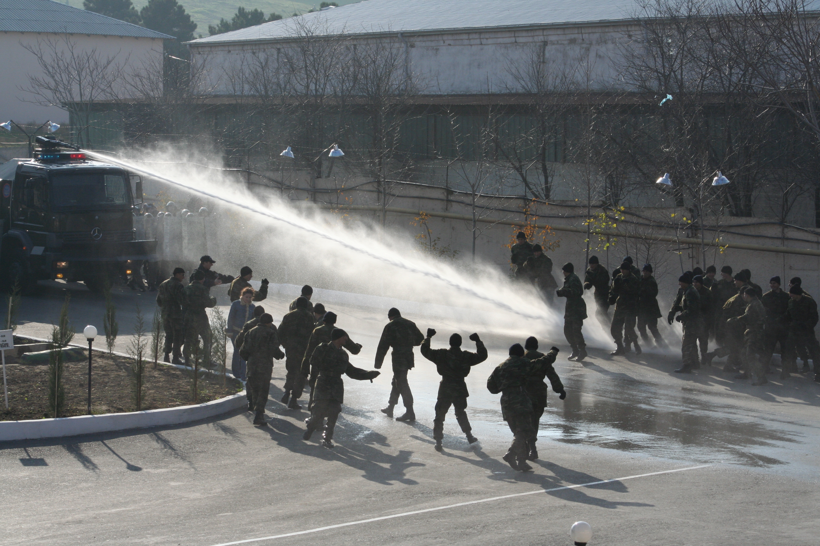 Officers take part in a crowd-control exercise, part of a week-long training programme for law enforcement agencies in Azerbaijan, Baku, December 2005.