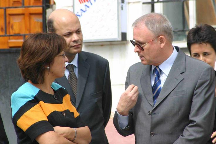The Head of the OSCE Office in Baku, Ambassador Maurizio Pavesi (r), speaks with the Chair of Transparency Azerbaijan, Rena Safaraliyeva, at the opening of the Anti-Corruption Centre in Guba, northern Azerbaijan, 8 September 2006.