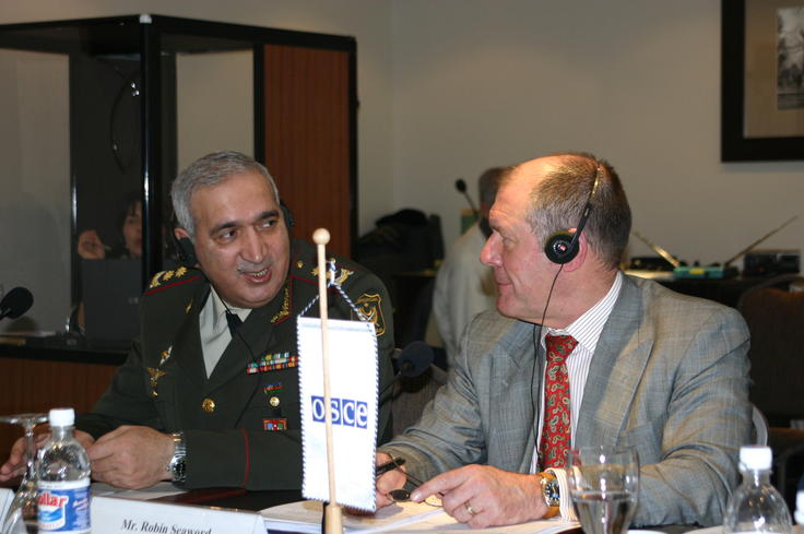 General Chingiz Mammadov (left), Deputy Defence Minister of Azerbaijan, at the meeting on civil-military relations with Robin Seaword, Deputy Head of the OSCE Office, in Baku, 14 February 2007.