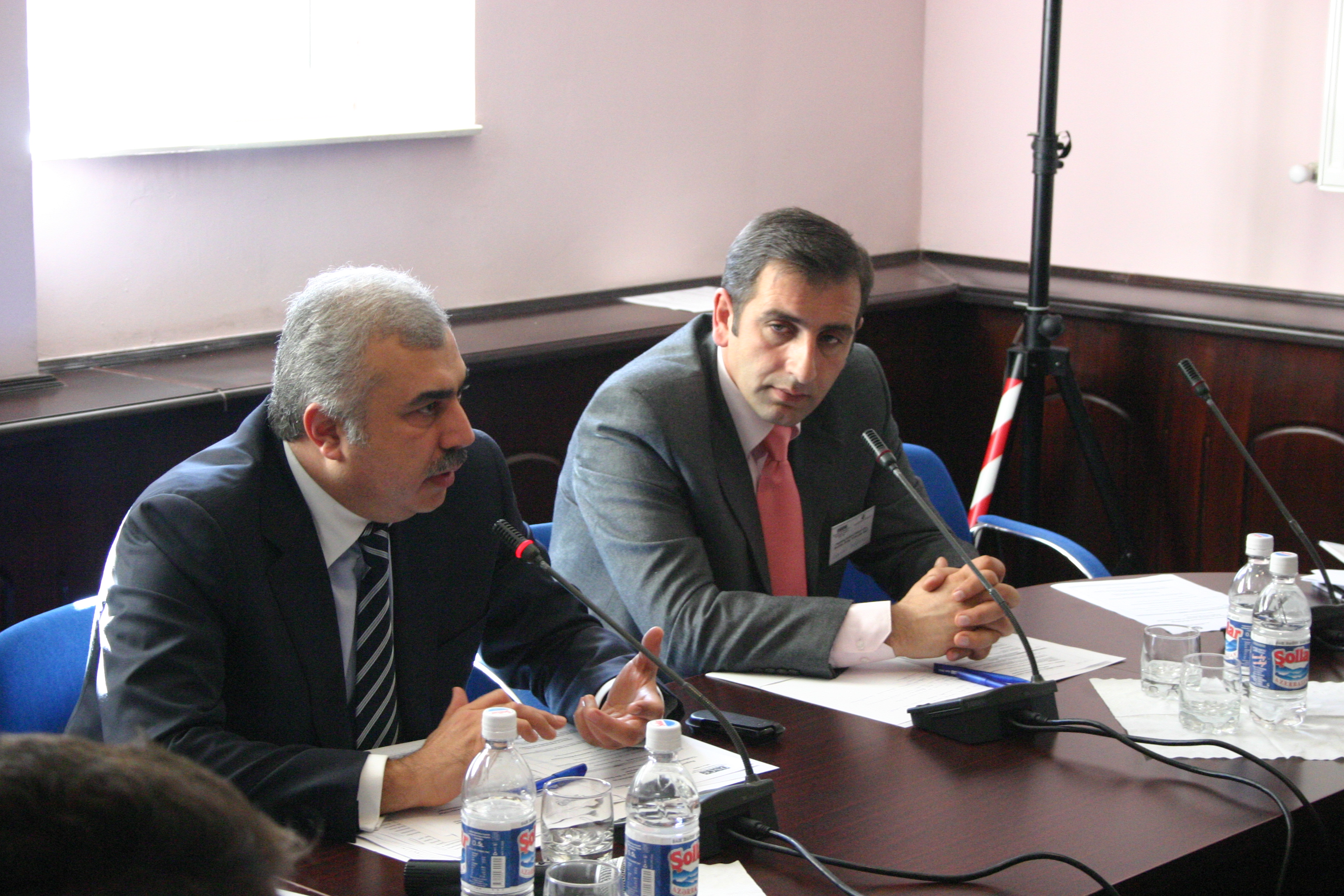 Azerbaijan's Deputy Minister of Economic Development, Niyazi Safarov (left), speaks about the challenges facing the country's farmers at a workshop on agricultural development organized by the OSCE Office in Baku, 13 November 2007.