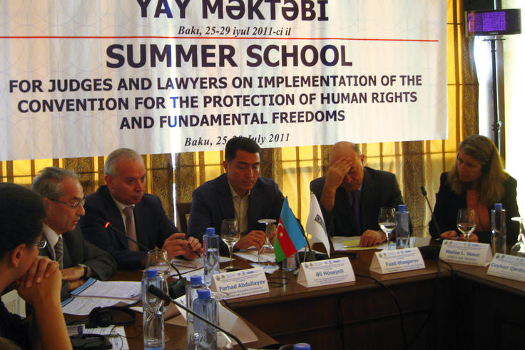 R-l: Melissa L. Stone, Acting Head of the OSCE Office in Baku; Fuad Alasgarov, Presidential Administration Department Director for Co-ordination of Law Enforcement Agencies; Ali Huseynli, Member of Parliament and Chair of Azerbaijan Lawyers' Confederation; Farhad Abdullayev, President of the Constitutional Court of Azerbaijan; and Azer Jafarov, Head of the Organizational and Administration Department, Ministry of Justice, at the launch of a week-long course on fundamental rights and freedoms for judges and lawyers, Baku, 25 July 2011.