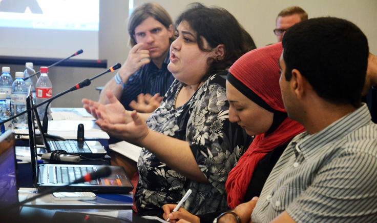 Local expert Khadija Ismayilova shares her experience on new media tools and e-journalism activities with participants of an online investigative journalism training course, Baku, 13 September 2011.