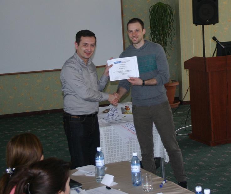 Nicholas Detsch, the Head of the Democratization Unit at the OSCE Office in Baku (now OSCE Project Co-ordinator in Baku), presents a certificate to the participant of the training course on public relations and political campaigning, Baku, 8 April 2012.
