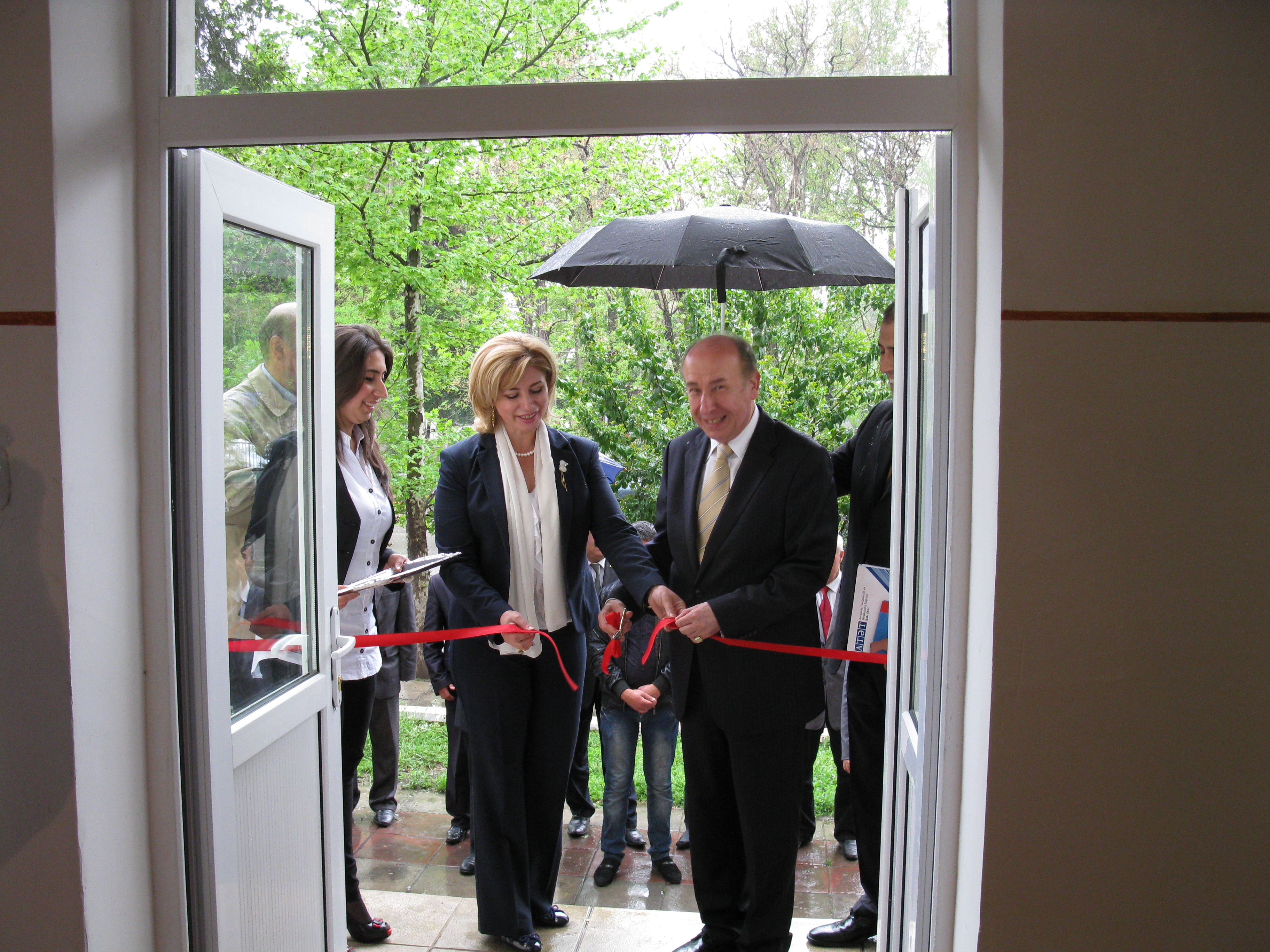 Ambassador Koray Targay (r), the Head of the OSCE Office in Baku, and Irada Javadova, the Chairperson of Education on Human Rights Public Association, open the OSCE-supported Legal Advice Centre in Mingachevir.