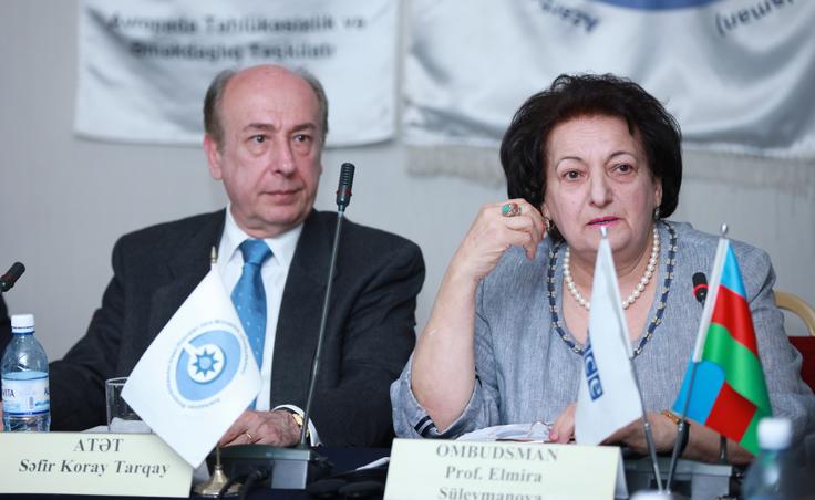 The Head of the OSCE Office in Baku, Ambassador Koray Targay (l) and Ombudsman Elmira Suleymanova at a workshop on detention monitoring and reporting on cases of torture under national preventive mechanisms held in Baku, 26 April 2012.