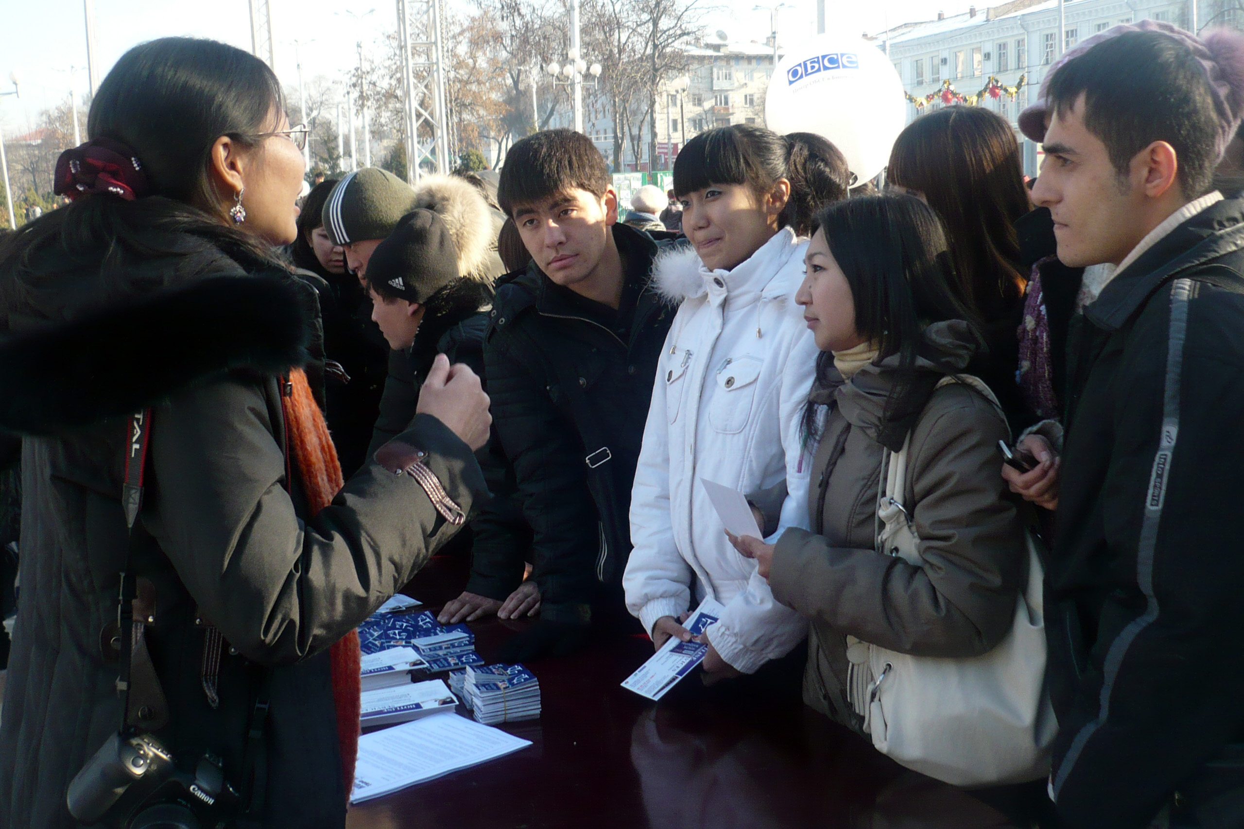 Volunteers distribute information and promotional materials to the participants of an event, organized by the OSCE Centre in Bishkek, for International Anti-Corruption Day, Bishkek, 9 December 2010.