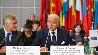 Laurent Fabius, the French President of the Constitutional Council and former COP21 President, focused on the close links between climate change and the environment; security and climate and how the fight against climate change contributes to international peace and security: “The OSCE, as the largest regional security organization in the world, can and should increase its involvement in this field. It can contribute to sharing experiences and good practices with regard to climate change adaptation measures and the development of climate resilient infrastructure. This is a crucial issue and the OSCE should devote a significant share of its activities to it.”