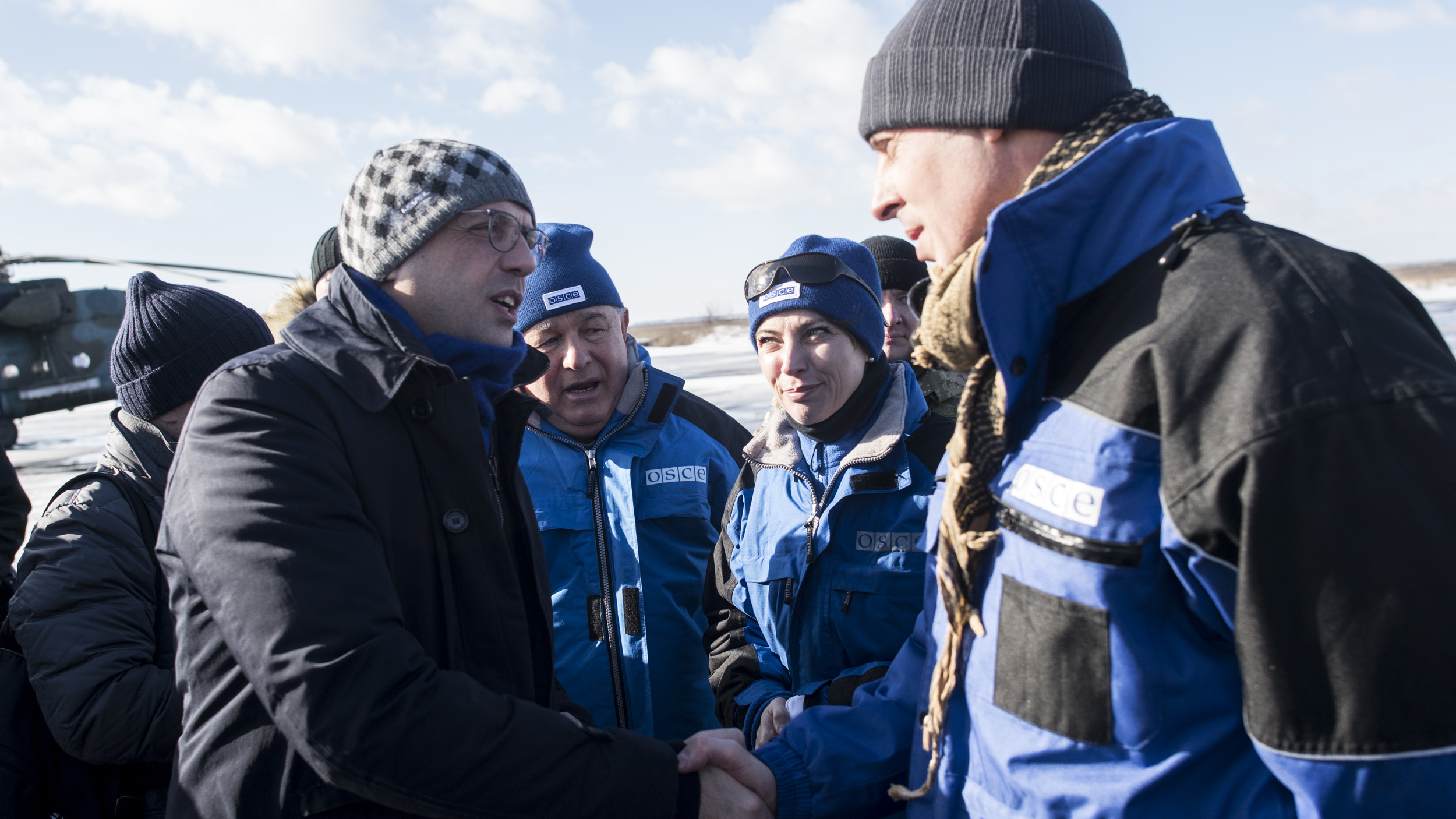 OSCE Chairperson-in-Office Angelino Alfano greeting a monitoring officer from the OSCE Special Monitoring Mission to Ukraine, Mariupol, 31 January 2018.