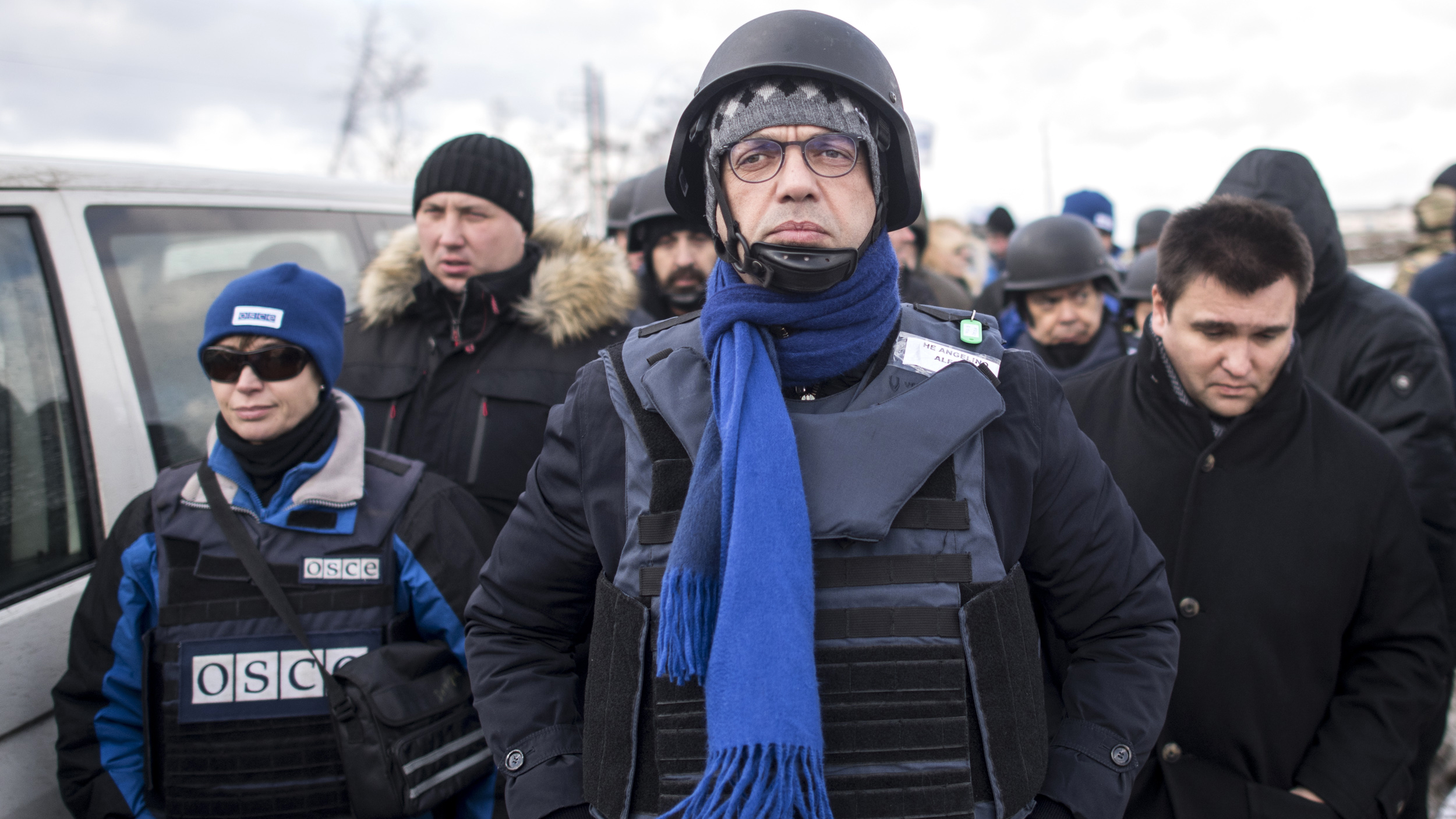 OSCE Chairperson-in-Office and Italian Minister of Foreign Affairs Angelino Alfano close to the entry-exit checkpoint near government-controlled Pyshchevyk, eastern Ukraine, 31 January 2018.