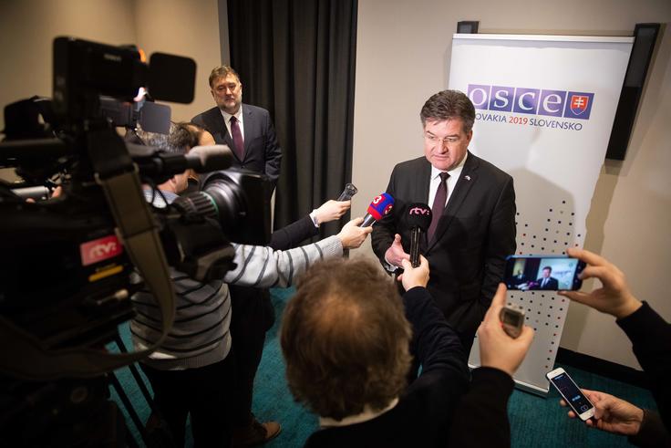 OSCE Chairperson-in-Office Slovak Minister of Foreign and European Affairs Miroslav Lajčák speaks to media representatives during his official visit to Moldova, 18 January 2019.