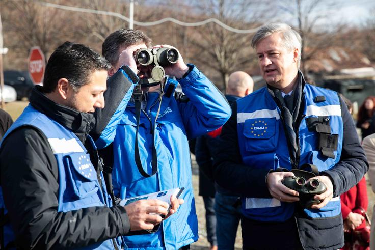 OSCE Chairperson-in-Office Slovak Minister of Foreign and European Affairs Miroslav Lajčák (centre) during his trip to Georgia where he went to visit Odzisi near the administrative boundary line, 10 February 2019.