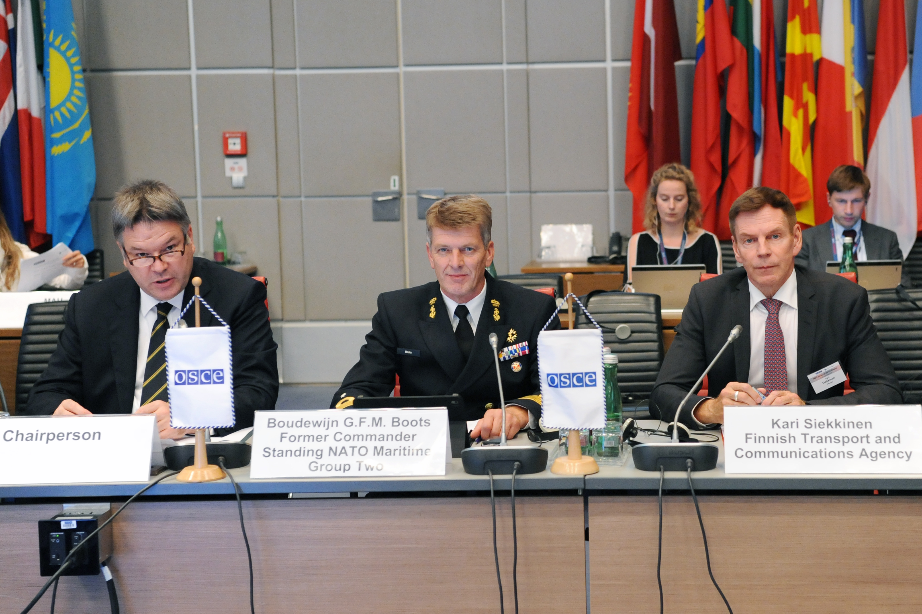 (L-r) Ambassador Jeroen Boender, Permanent Representative of the Netherlands to the OSCE and Chair of the Informal Working Group of the Structured Dialogue, Commodore RNLN (Royal Netherlands Navy) Boudewijn G.F.M. Boots, former Commander Standing NATO Maritime Group Two, and Kari Siekkinen, Chief Advisor at the Finnish Transport Safety Agency, address the Expert-Level Workshop of the Structured Dialogue, Vienna, 20 September 2019.