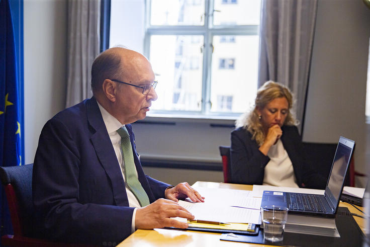 Sweden’s Deputy Minister for Foreign Affairs Robert Rydberg addresses the OSCE Permanent Council remotely from Stockholm as Petra Lärke, Head of the Task Force for the incoming Swedish OSCE Chair, listens. Stockholm, 16 July 2020.