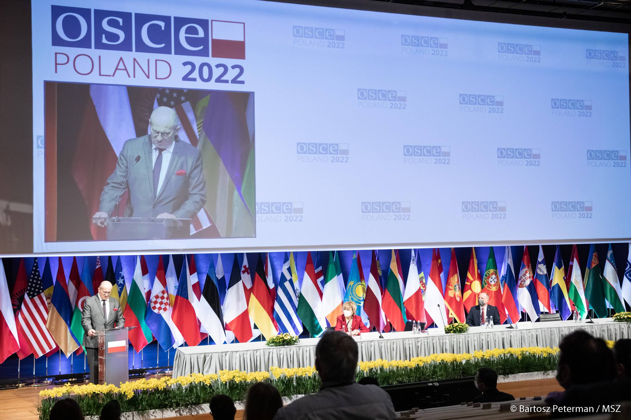 OSCE Chairman-in-Office and Minister for Foreign Affairs of Poland Zbigniew Rau addressing a conference on Combating Anti-Semitism in the OSCE Region on 8 February 2022 in Warsaw.