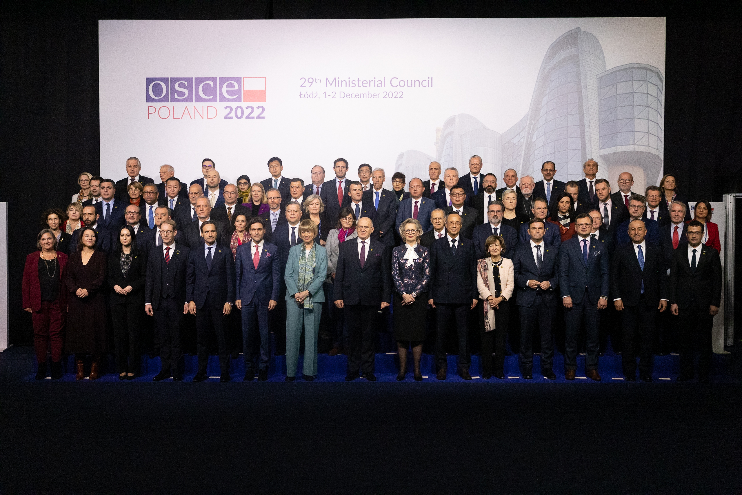 OSCE Foreign Ministers and Heads of Delegations pose for a family photo at the 29th Ministerial Council in Łódź, 1 December 2022.