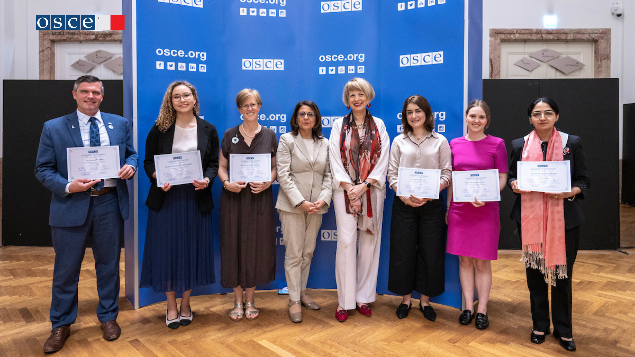 OSCE Secretary General, Helga Maria Schmid and the Chair of the Permanent Council, Ambassador Natasha Meli Daudey with the winners of the White Ribbon Award, Vienna, 11 July.