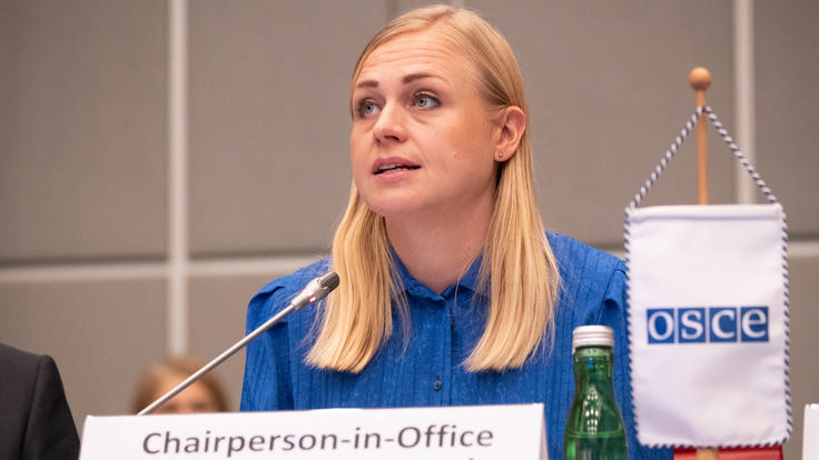 2025 OSCE Chairperson-in-Office, Minister for Foreign Affairs of Finland, Elina Valtonen, addressing the OSCE Permanent Council. Vienna, 23 January 2025.
