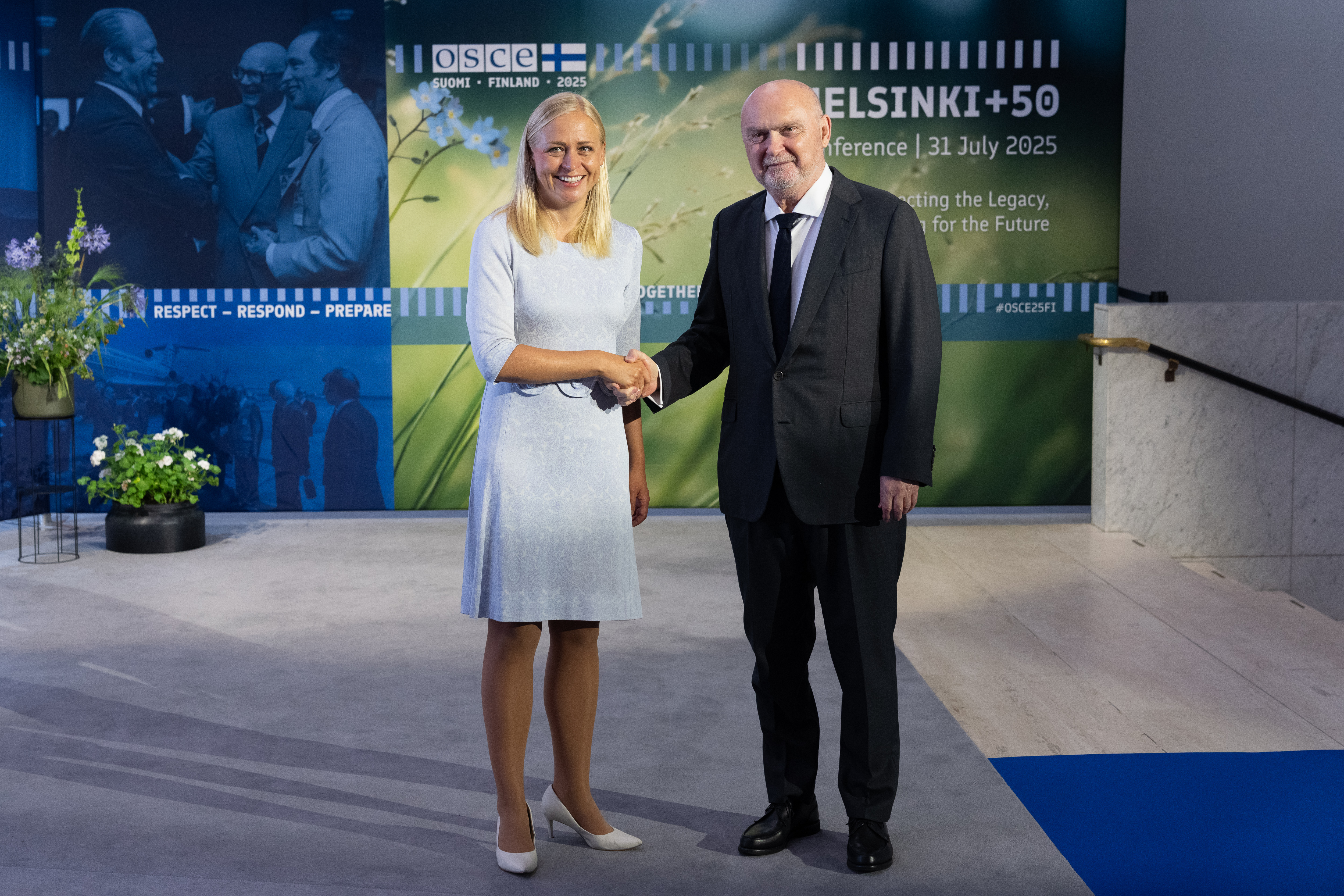 OSCE Secretary General Feridun H. Sinirlioğlu (right) and 2025 OSCE Chairperson-in-Office, Minister for Foreign Affairs of Finland, Elina Valtonen (left) at Helsinki+50 Conference, Helsinki, 31 July 2025.