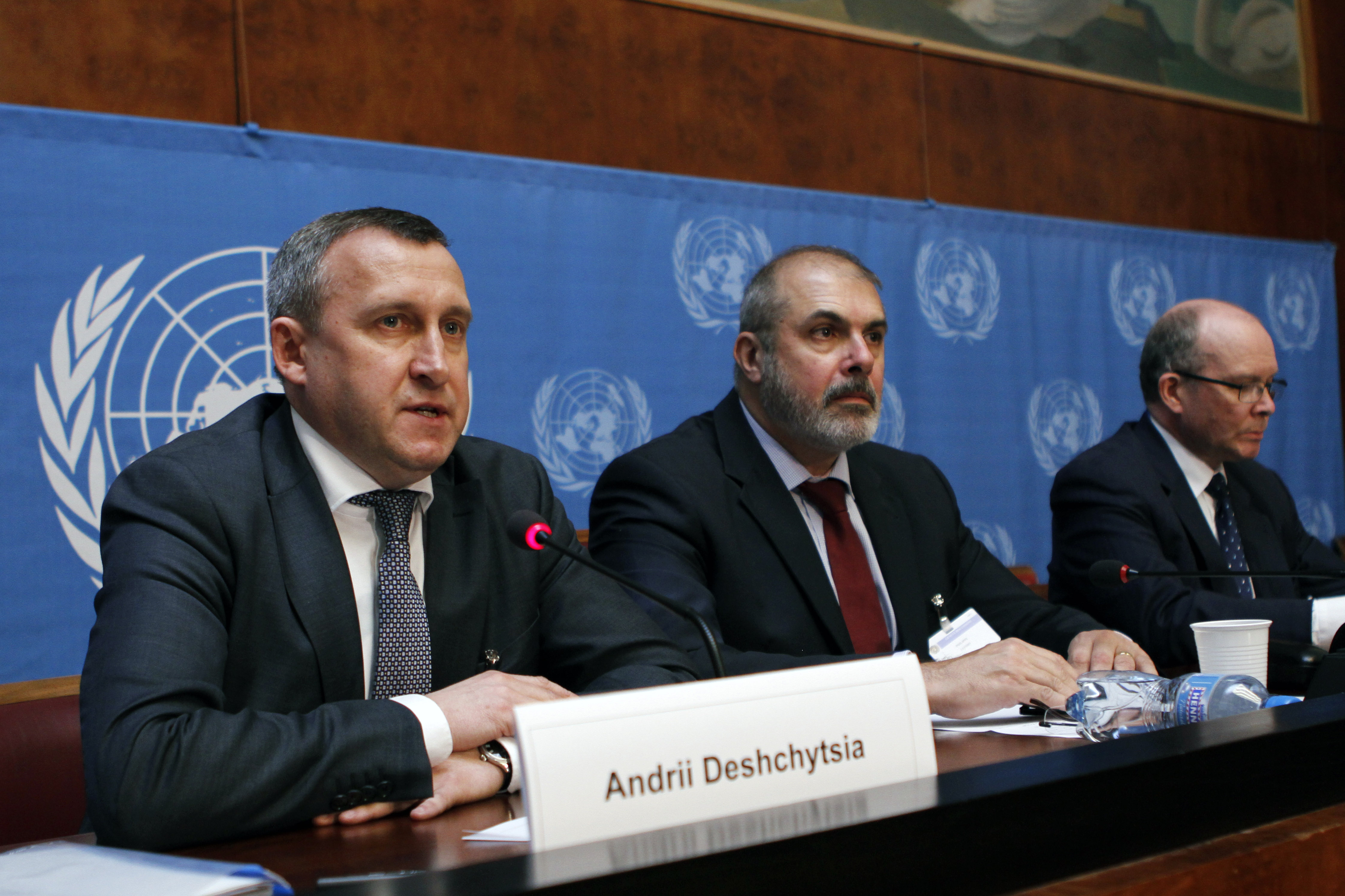 The OSCE Chairperson's Special Representative for conflicts, Ambassador Andrii Deshchytsia (l), EU Special Representative Philippe Lefort and UN Representative Antti Turunen at the concluding press conference of the 23rd round of the Geneva International Discussions, 27 March 2013.