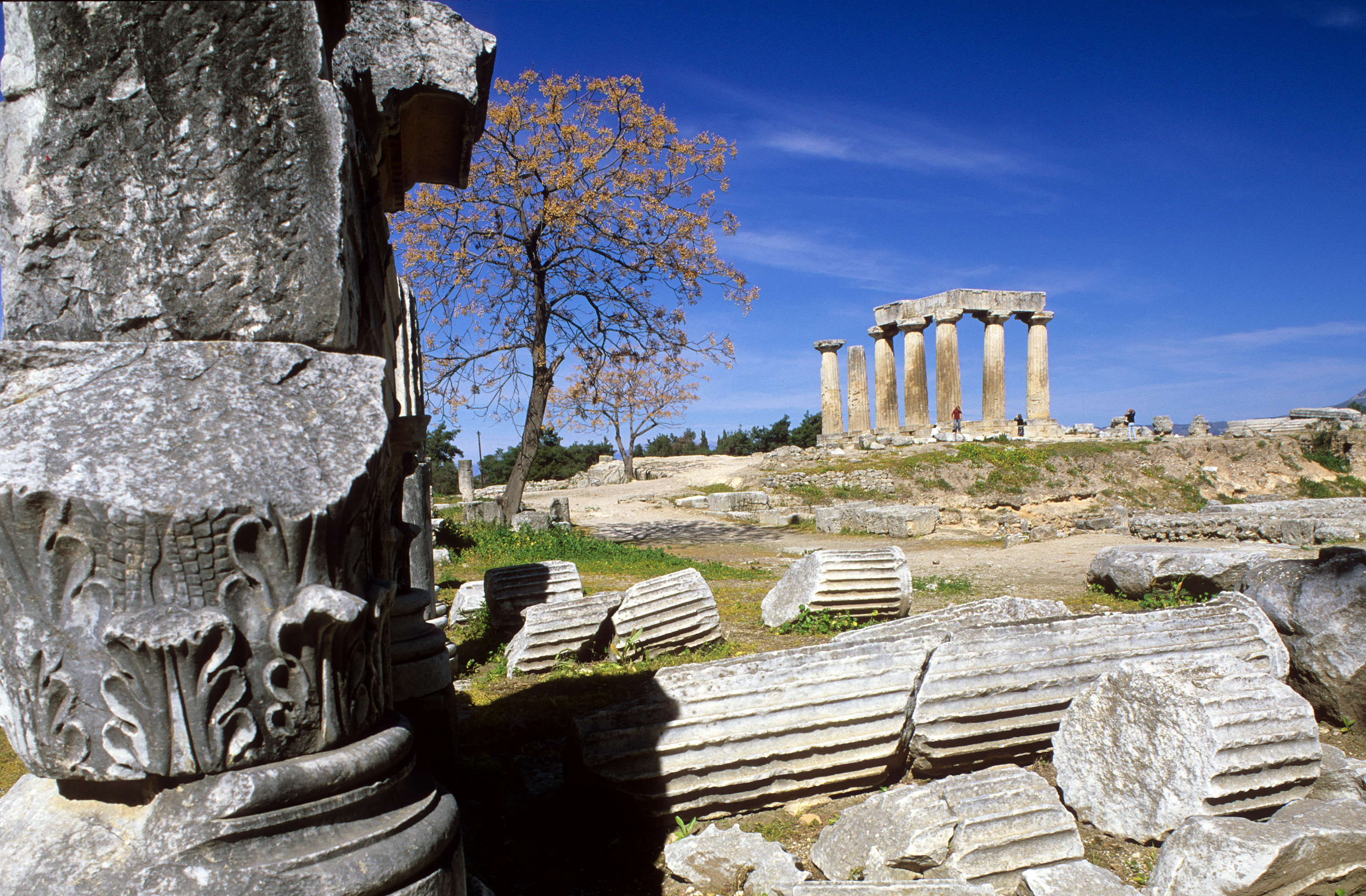 Ruins of the temple of Apollo in ancient Corinth, Greece. The temple was built around 550 BC.