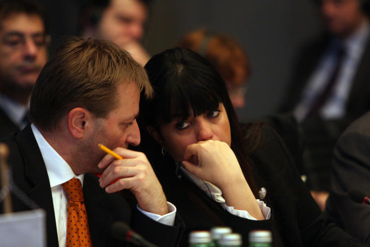 Ambassador Mara Marinaki (Right) of Greece, the Chairperson of the OSCE Permanent Council, listens to the Head of the OSCE Conference Services, Hans-Michael Plut, at the Hofburg in Vienna 29 January 2009.