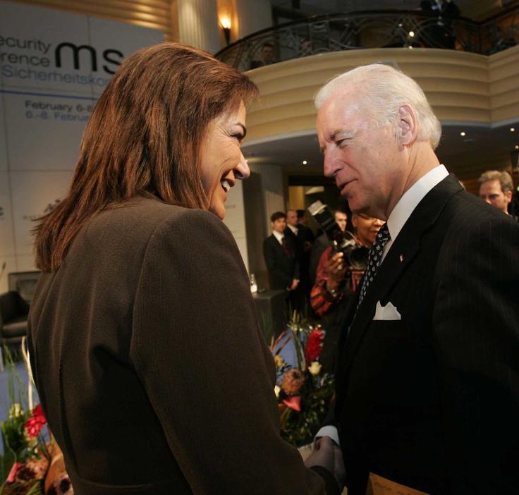 OSCE Chairperson-in-Office, Greek Foreign Minister Dora Bakoyannis (left), meets US Vice-President Joe Biden at the Munich Security Conference, 7 February 2009.