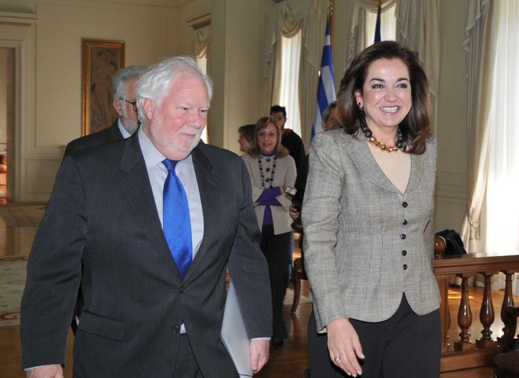 OSCE Chairperson-in-Office and Greek Foreign Minister Dora Bakoyannis (right) with the Personal Representative on Combating Anti-Semitism, Rabbi Andrew Baker, at the Foreign Ministry in Athens, 3 March 2009.