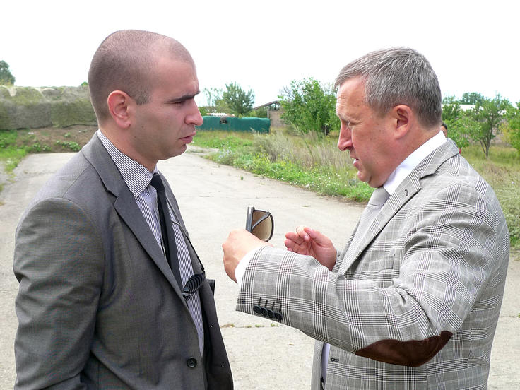 Ambassador Andrii Deshchytsia, the Special Representative of the OSCE Chairperson-in-Office for Conflicts (r), speaks with Kakhaber Kemoklidze of the Georgian Interior Ministry’s Analytical Department, Ergneti, 30 July 2013.