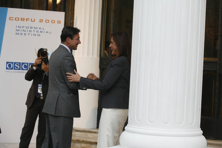 The OSCE Chairperson-in-Office, Greek Foreign Minister Dora Bakoyannis (r), greets Dutch Foreign Minister Maxime Verhagen at the opening of the informal meeting of OSCE foreign ministers, Corfu, 27 June 2009.