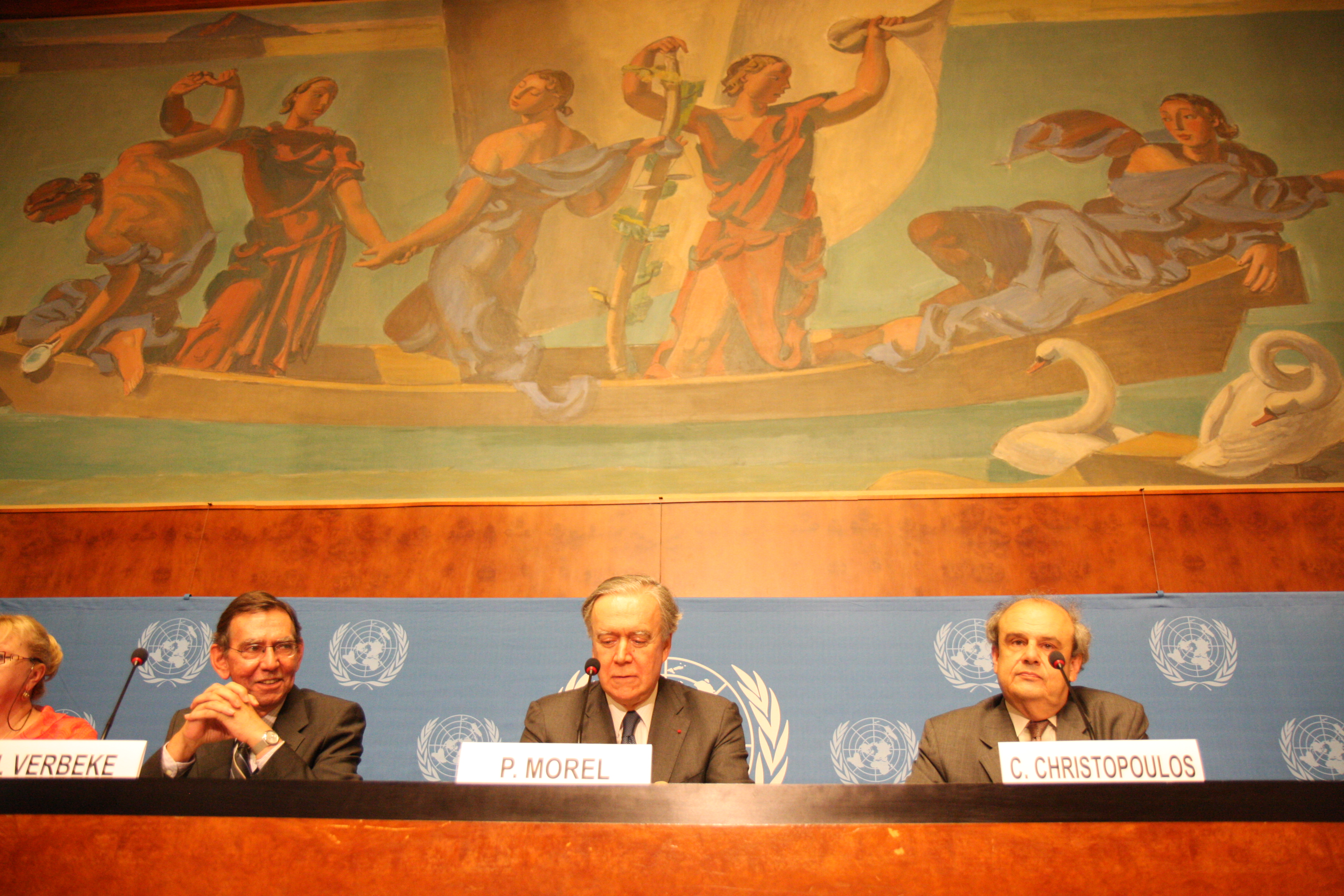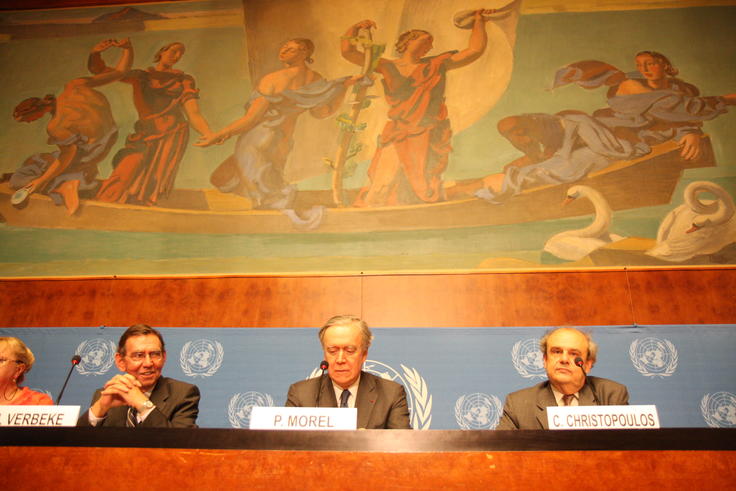 L-r: Ambassador Johan Verbeke (UN), Ambassador Pierre Morel (EU) and Ambassador Charalampos Christopoulos, Special Representative of the OSCE Chairperson-in-Office, at a news conference in Geneva, 1 July 2009.