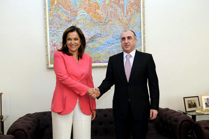 OSCE Chairperson-in-Office and Greek Foreign Minister Dora Bakoyannis (l), with Azerbaijan's Foreign Minister Elmar Mammadyarov in Baku, 2 July 2009.