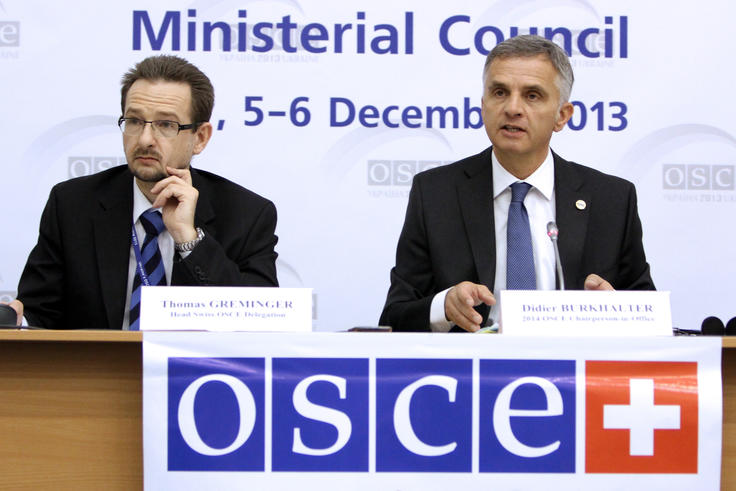 Didier Burkhalter (r), OSCE Chairperson-in-Office for 2014 and Swiss Foreign Minister, speaking at the OSCE Ministerial Council in Kyiv alongside the Chairperson of the OSCE Permanent Council for 2014, Swiss Ambassador Thomas Greminger, 6 December 2013.