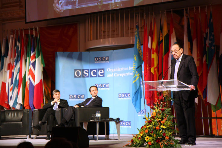 Former German Foreign Minister Hans-Dietrich Genscher (r), watched by Greece's Alternate FM Dimitris Droutsas (c) and Austrian FM Michael Spindelegger, addresses an OSCE event in Vienna to mark the anniversary of the fall of the Berlin Wall, 6 Nov 2009.