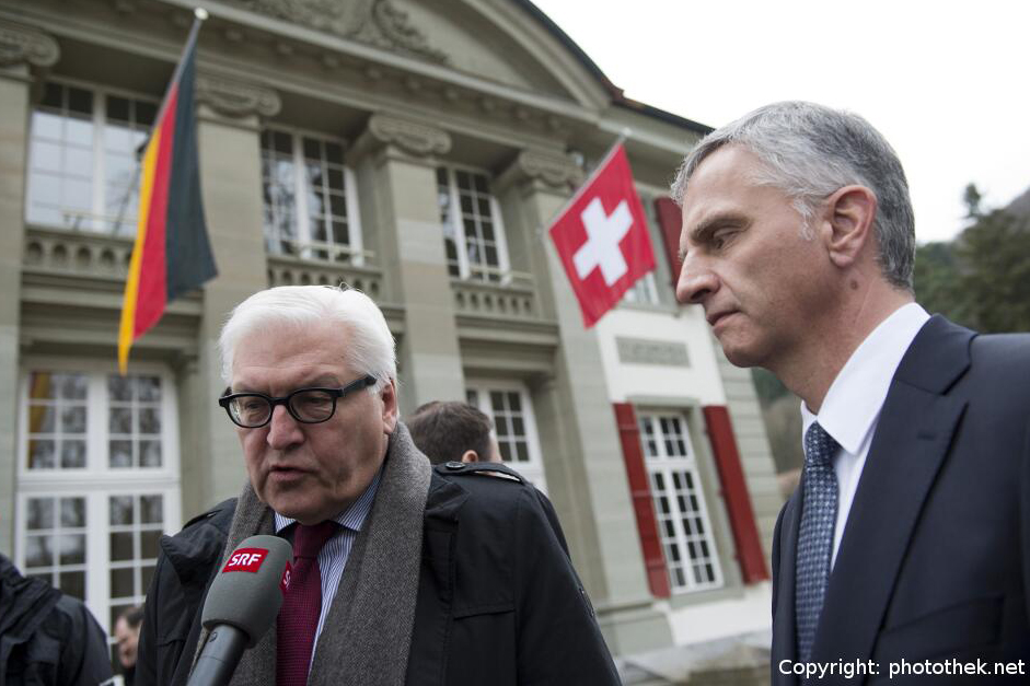 OSCE Chairperson-in-Office, Swiss Foreign Minister Didier Burkhalter (r) alongside German Minister of Foreign Affairs Frank-Walter Steinmeier speaking to the media after a meeting on the situation in Ukraine, Bern, 4 March 2014.