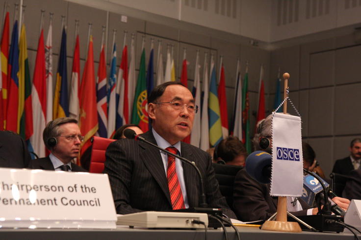 The OSCE Chairman-in-Office, Kazakhstan's Secretary of State and Foreign Minister Kanat Saudabayev, addresses the Permanent Council in Vienna, 14 January 2010.