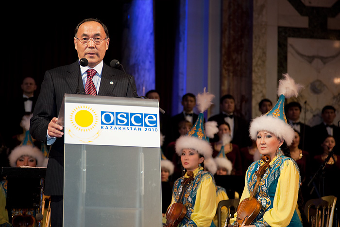 Kazakh Secretary of State and Foreign Minister Kanat Saudabayev welcomes guests to a folklore concert to mark the start of Kazakhstan's 2010 OSCE Chairmanship, Vienna, 13 January 2010.