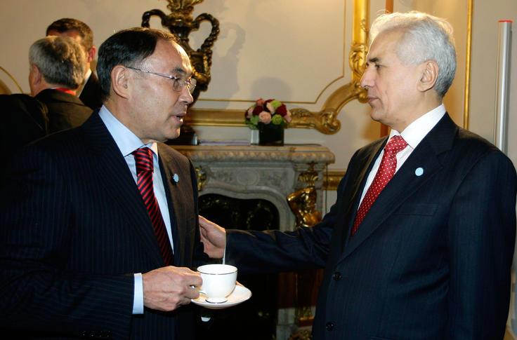 The OSCE Chairperson-in-Office, Kazakhstan's Secretary of State and Foreign Minister Kanat Saudabayev (l), meets his counterpart from Tajikistan, Hamrokhon Zarifi, during an informal session at a major conference on Afghanistan in London, 28 January 2010.