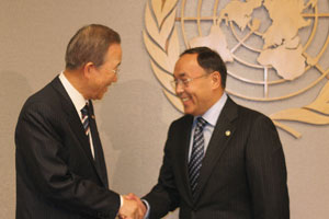The OSCE Chairperson-in-Office, Kazakhstan's Secretary of State and Foreign Minister Kanat Saudabayev (right), meets UN Secretary-General Ban Ki-Moon following an address to the UN Security Council, New York, 5 February 2010.