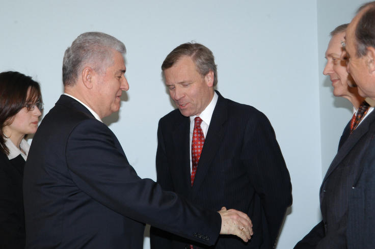 The OSCE Chairman-in-Office, Netherlands Foreign Minister Jaap de Hoop Scheffer (left), met the Moldovan President Vladimir Voronin in Chisinau, 3 April 2003.