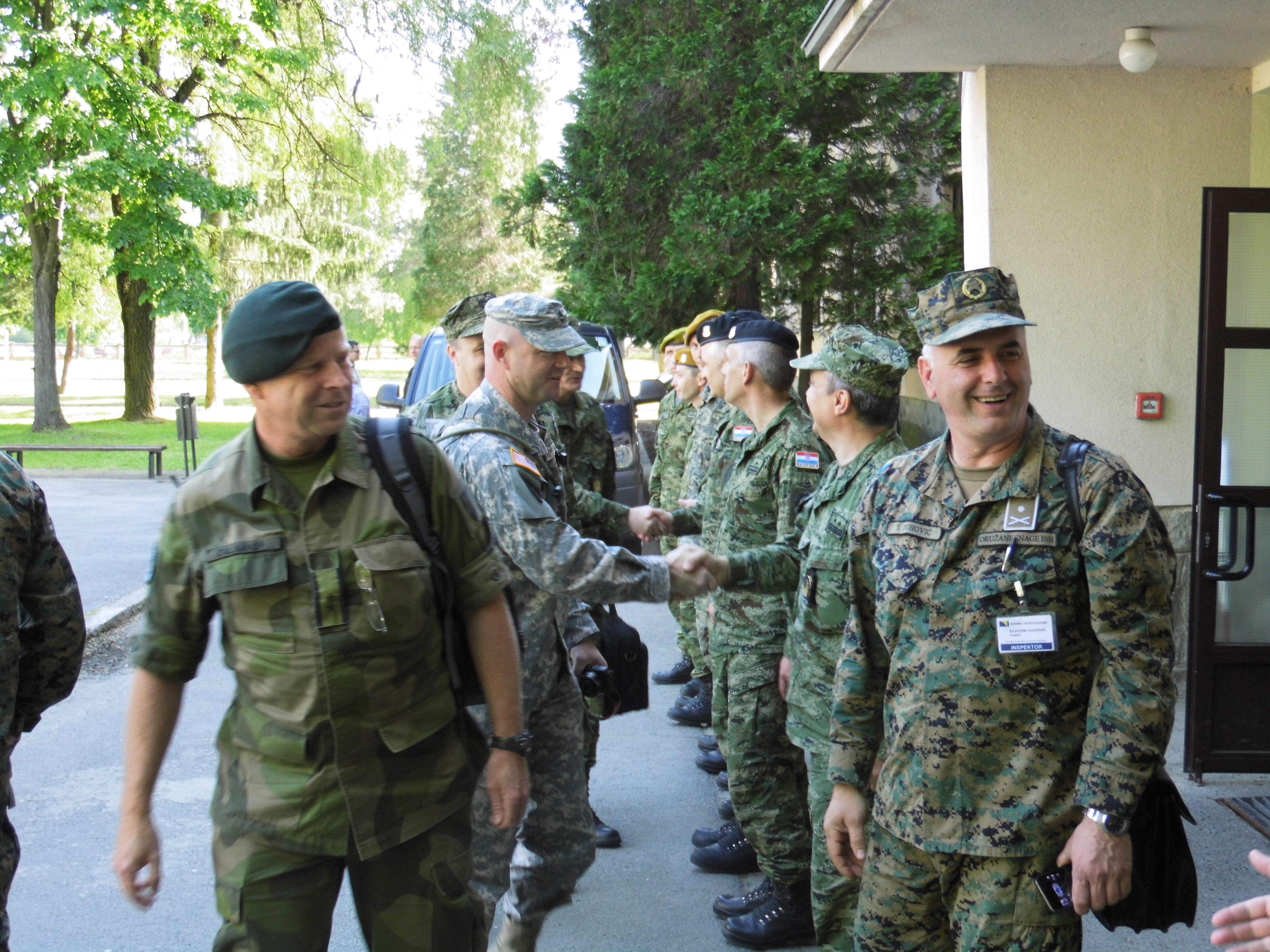 Escort Team from Croatia welcomes the Inspection Team of Bosnia and Herzegovina during an inspection of the Mechanized Battalion “PUME” in Našice, Croatia, May 2014. In the centre of the image assistants from Norway and USA accompany the team.
