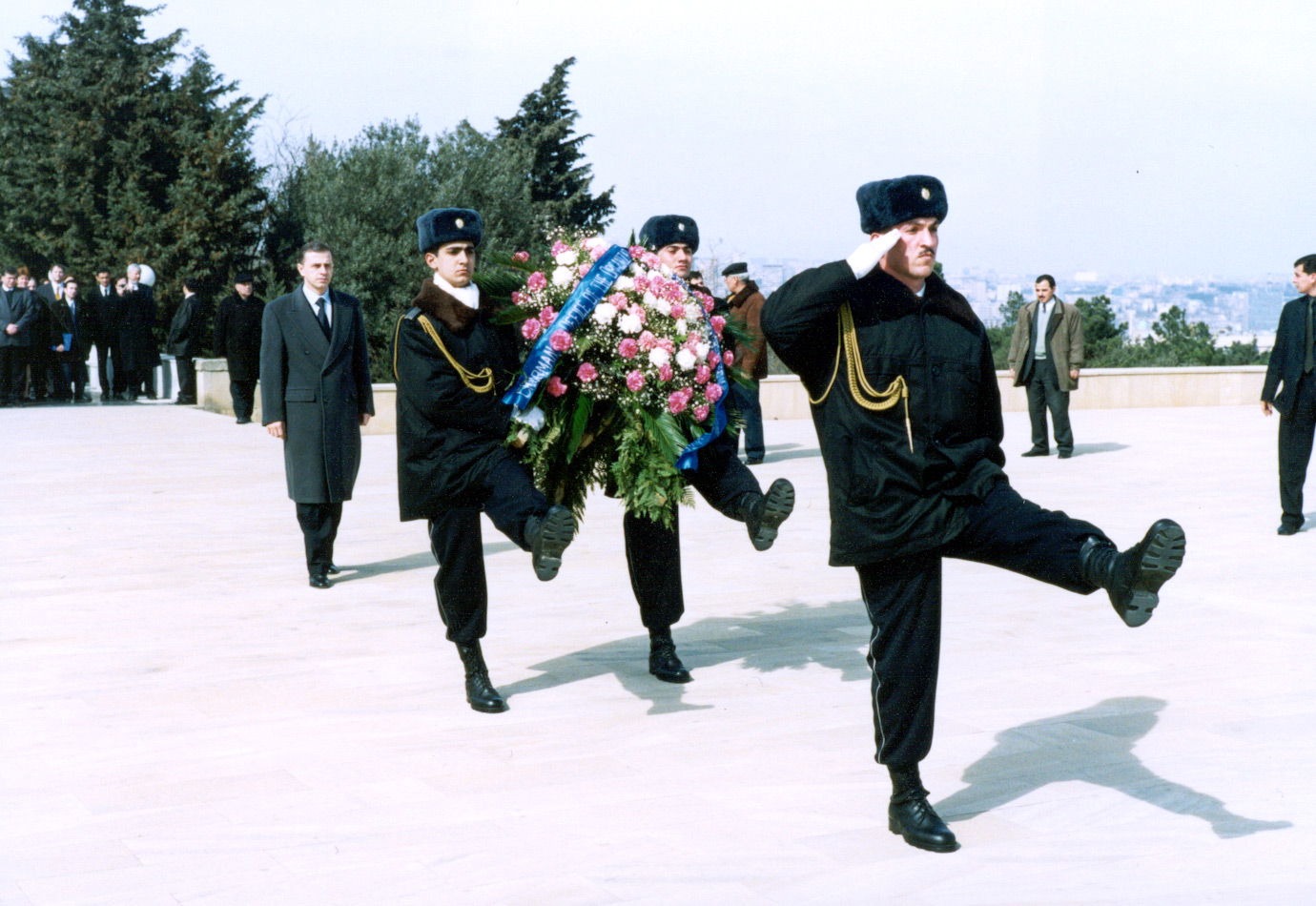 Geoana (left), at the Shekhid Memorial in Baku, 1 March 2001.