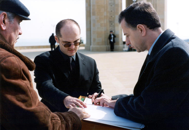 OSCE Chairman-in-Office, Romanian Foreign Minister Mircea Geoana (right), at the Shekhid Memorial in Baku, 1 March 2001.