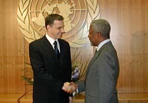 The OSCE Chairman-in-Office, Romanian Foreign Minister Mircea Geoana, meets with United Nations Secretary General Kofi Annan in New York, 2 February 2001.